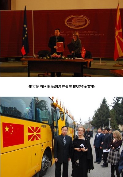 2011年11月25日,中国援助马其顿校车项目交接仪式在马总理府举行。中国政府代表驻马其顿大使崔志伟正式将援助校车交付马副总理阿里菲。