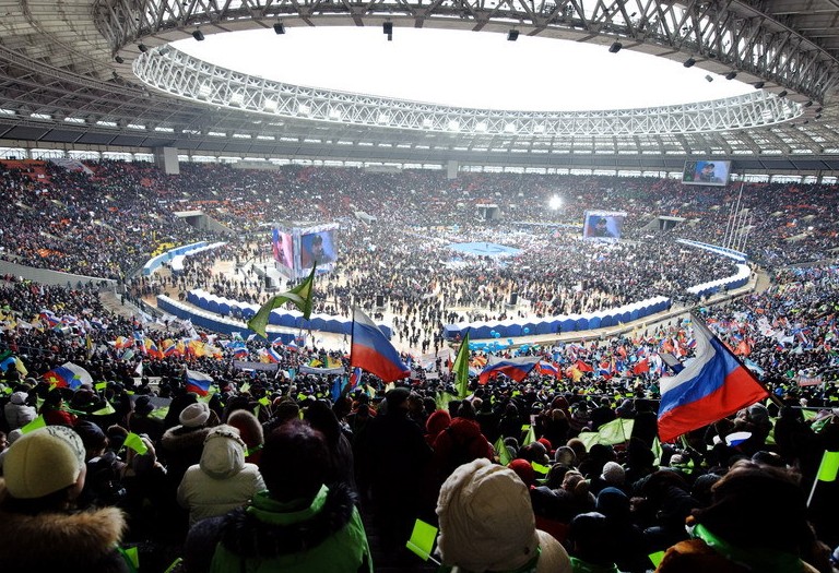 2月23日,莫斯科4名2012年俄总统大选候选人在当日组织集会。普京支持者13万人在卢日尼基体育馆举行了当天最大规模的“挺普”活动。