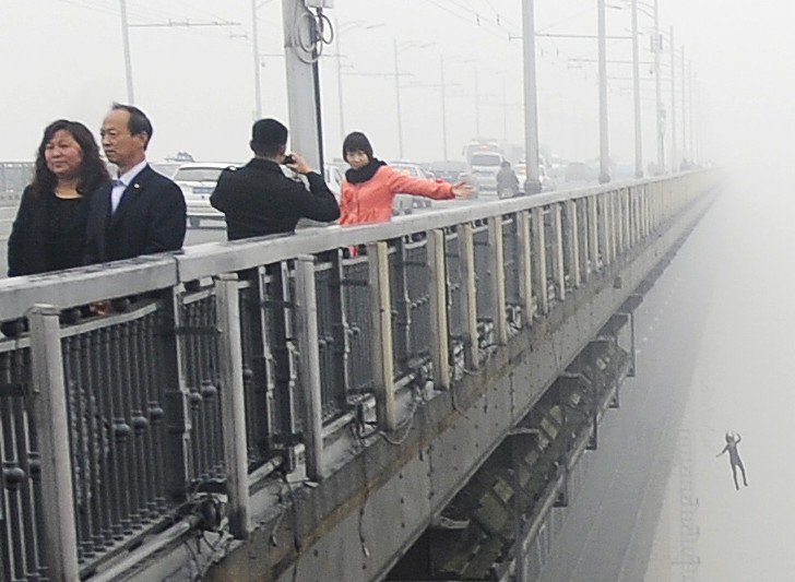 2013年2月27日中午12时,记者在长江大桥武昌桥头堡处拍雾霾天气照片,突然有人呼喊“江面上有个人”。记者朝大桥下方看去,发现在距武昌江滩约百余米处,有一人在水中挣扎,时隐时现。就在这时,又有人爬上大桥护栏,一跃而下,记者根本来不及阻拦。图片来源:李溪/CFP