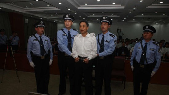 法警给被告人薄熙来戴上戒具带出法庭