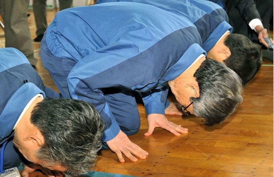 东京电力公司社长清水正孝5月4日前往福岛县二本松市体育馆的安置点,向受福岛第一核电站事故影响在该处避难的福岛县浪江町居民道歉。