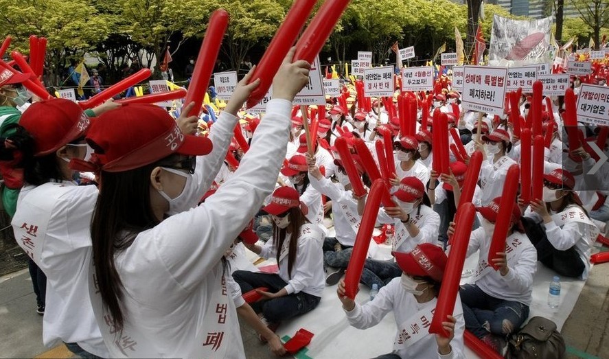 2011年5月4日,韩国首尔,大约有1000名妓女聚集在首尔红灯区,抗议韩国警方对色情行业的打击。她们戴着统一的帽子和口罩以隐藏身份,谴责《性买卖特别法》威胁他们的生计。宿迁律师网姜亚春律师