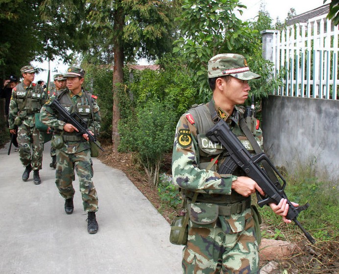 10月3日,浙江嘉兴警方组织千余名公安、武警对“9·26”杀人逃犯可能藏匿的场所进行“地毯式”搜捕。9月26日,嘉兴市凤桥镇发生一起因家庭矛盾纠纷引发的恶性杀人案件,犯罪嫌疑人苏清建杀害三人后潜逃。截至目前,杀人嫌犯仍未抓获。图为武警官兵正在对可能藏匿的区域仔细搜索。