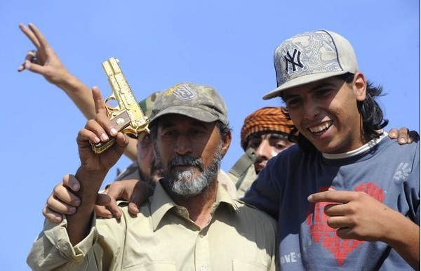 当地时间2011年10月20日,利比亚苏尔特,利比亚过渡委士兵展示从卡扎菲身上缴获的金手枪